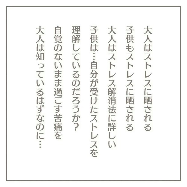 ストレスの大きさは人それぞれですが、大人も子どももストレスを感じます。大人だって厄介なストレス。子どもの感じる苦痛はどれほどのものでしょうか。