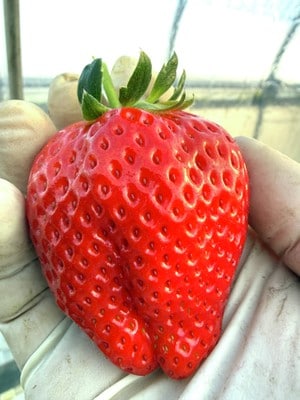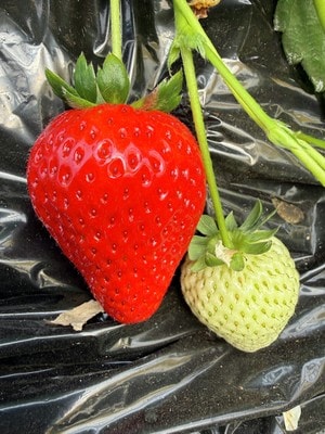 中村さん収穫のいちご。ヘタが実に寄らず、上向きに伸びている
