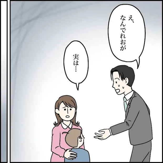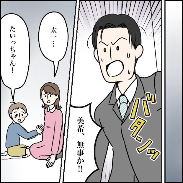 しばらくして、太一が自宅に到着しました。慌てて飛んできたのか、ぜぇぜぇと息を切らしながら「美希、無事か!」とまっすぐ私のもとへ駆け寄ってきます。私とれおくんは、「太一・・・」「たいっちゃん!」と同時に太一の名前を呼びました。