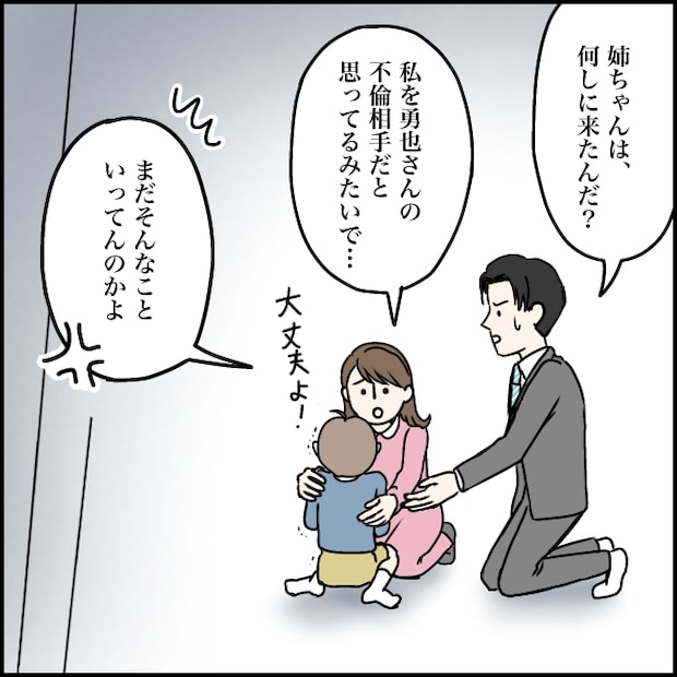 「姉ちゃんは何しに来たんだ?」太一が険しい表情で問いかけます。「私を勇也さんの不倫相手だと思ってるみたいで・・・」そう答えると、太一は「まだそんなこといってんのかよ」と怒りをあらわにしました。このまま玲美さんを放っておけば、また何かされるかもしれない。そう思った私たちは、義両親に今回の件を話すことにしました。