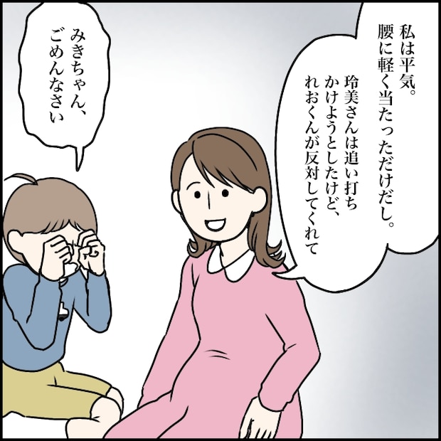 私は腰のあたりをさすりながら、「平気、腰に軽く当たっただけだし」と太一に伝えました。幸い、れおくんの攻撃は腰に当たっただけで、お腹の赤ちゃんは無事でした。「玲美さんはさらに追い打ちをかけようとしたけど、れおくんが止めてくれてね」私がそう話すと、れおくんは「みきちゃん、ごめんなさい」と言って再び泣き出しました。