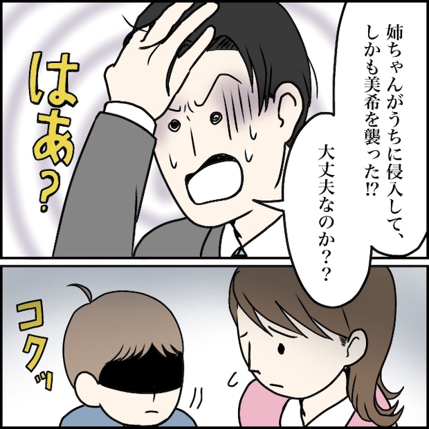 愛妻家の夫・太一さんと結婚して現在妊娠中の美希さん。優しい義両親にも恵まれ、幸せな毎日を送っていました。ただ、太一さんの姉・玲美さんだけは別。初顔合わせの時から嫌味ばかり言ってくる玲美さんのことが、美希さんはどうにも苦手でした。ある日、いつものように義実家へ顔を出すと、いつにも増して虫の居所が悪い玲美さんの姿が。美希さんが、玲美さんの息子れおくんに触れると、「触らないで!あんたが勇也さんと不倫してること知ってるんだから!」と急に訳の分からないことを言い出しました。玲美さんの夫・勇也さんとは結婚式で一度会ったきり。おまけに単身赴任中で、美希さんと不倫するのは物理的にも無理があります。しかし、玲美さんはそれでも2人の不倫を疑っているようで、嫌がらせはエスカレート。見かねた太一さんが実家に行って話をつけてくれることになりました。これで収まるだろうと思った美希さんでしたが、仕事から帰宅すると部屋が荒らされていてびっくり。すると突然背後から棒のようなもので攻撃されて倒れ込んでしまいます。背後に目をやると、そこにはれおくんの姿が。どうやら玲美さんに言われて美希さんを攻撃したようです。れおくんは一度攻撃したものの、美希さんが嫌がっている姿を見て、悪いことをしていると自覚したのか、その場で号泣。うまくいかないことに腹を立てた玲美さんは、れおくんを置いて部屋を出て行ってしまいました。