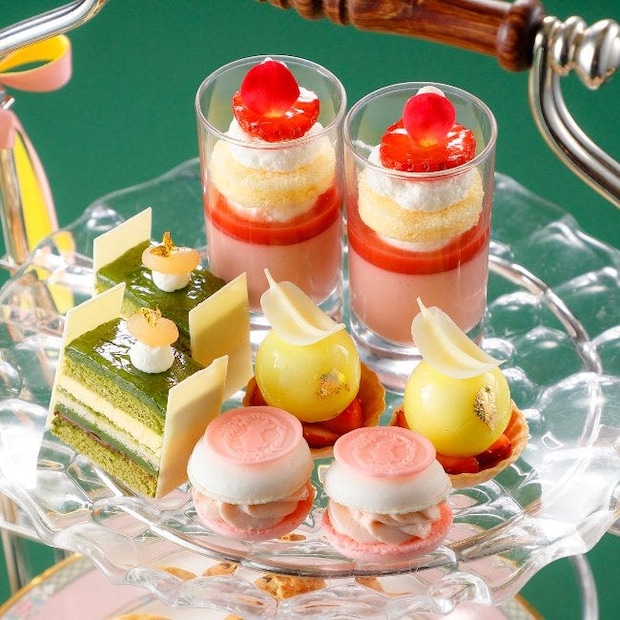 ティースタンドの上段には、春らしい華やかな色合いの「ベリーのパンナコッタ」や、かわいらしいうさぎがデザインされた「苺のマカロン」など、甘酸っぱい旬のいちごを使用したスイーツが並ぶ。このほかにも、層の重なりが美しい「抹茶のオペラ」や、なめらかなムースが乗った「苺とチーズムースのタルト」など、パティシエ自慢のスイーツが用意される。