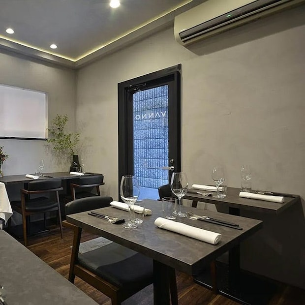 期待を膨らませて「VANNO」に足を運ぶと、おしゃれな空間が広がり、大人の隠れ家といった趣。内装やインテリアは落ち着いた色味でまとめられ、ヴィンテージオーディオまで置かれています。その音色が心地よく、穏やかな雰囲気の中で食事を楽しむことができそう。