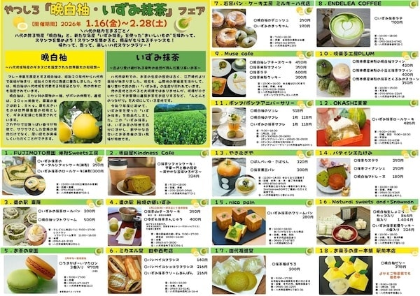 期間中は、八代市内の参加店舗や「八代よかとこ物産館」で、晩白柚やいずみ抹茶を使った商品を楽しめる。また、抽選で特産品が当たるスタンプラリーも同時開催している。
