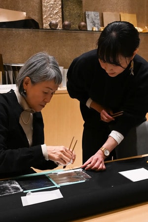 箔座の職人から箔の扱いについてレクチャーを受ける須藤玲子氏