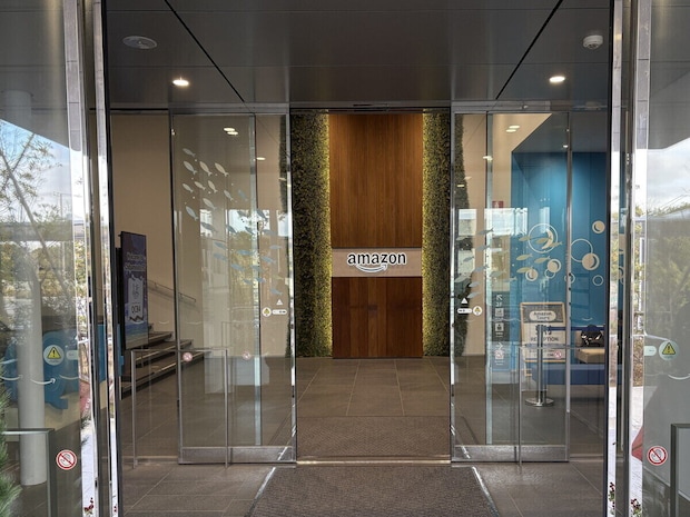 ロビーに足を踏み入れると、正面の「Amazon」ロゴが堂々と存在感を放っています。木目調の壁とグリーンパネルがつくる空間が、ホッとする温かさを演出。