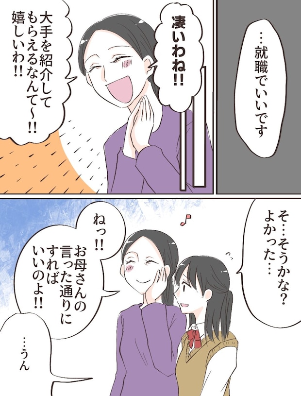 やっぱり母には逆らえない。そう悟った私は「・・・就職でいいです」と小さくつぶやきました。先生は不安そうな表情を浮かべていましたが、私自身がそう口にした以上、これ以上踏み込むことはできなかったのでしょう。その後、私は大手企業への就職が決まりました。母は「凄いわね!大手を紹介してもらえるなんて嬉しいわ!」と上機嫌。「ねっ!お母さんの言った通りにすればいいのよ!」と満足そうに言われ、私は複雑な思いを抱えたまま「・・・うん」と返事をしました。