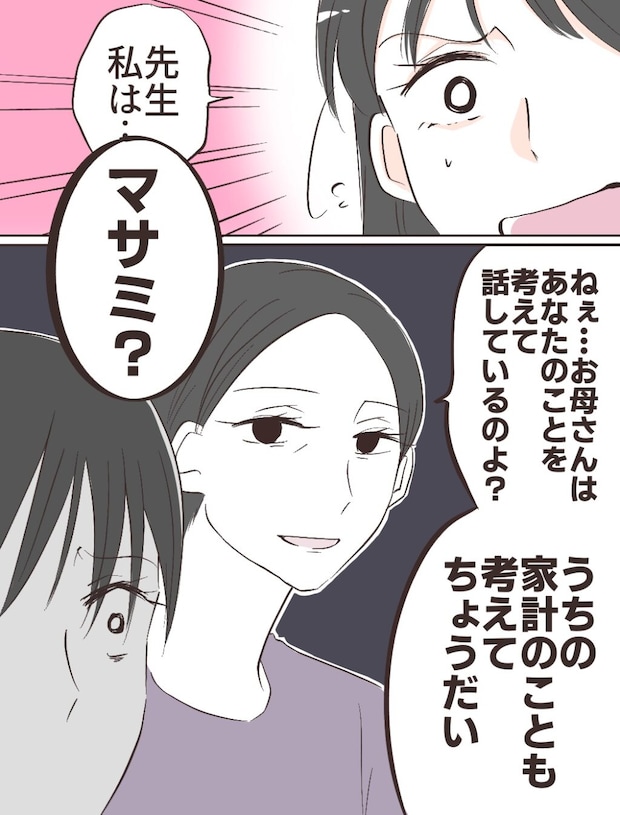 私は意を決して、自分の気持ちを伝えようと口を開きました。しかし言いかけた瞬間、「マサミ?お母さんはあなたのことを考えて話しているのよ?うちの家計のことも考えてちょうだい」と母の冷たい声に遮られてしまいました。