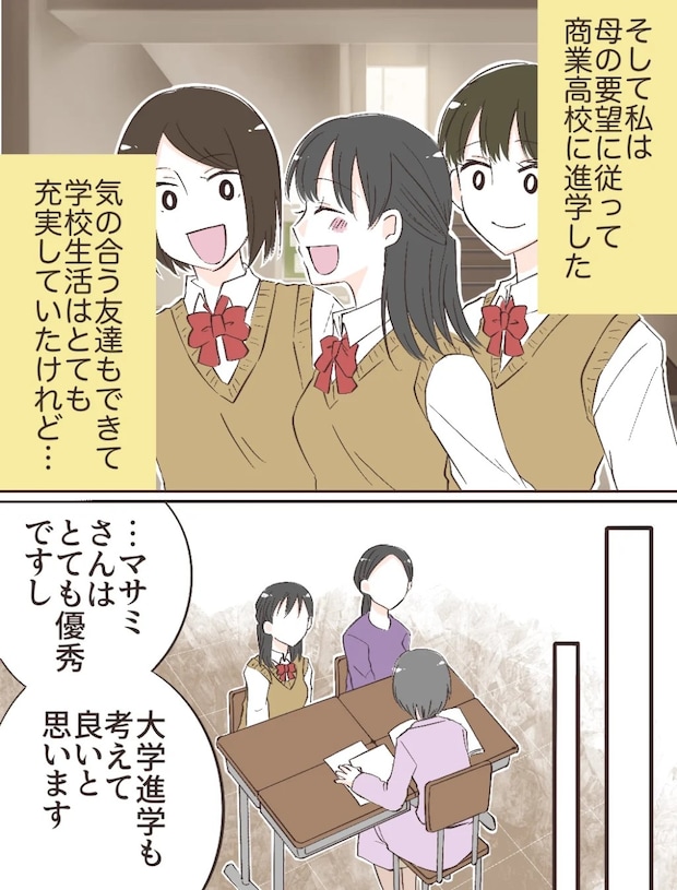 すると担任の先生が「それはもちろんですが、マサミさんの意見は?進学希望だとお聞きしているのですが・・・」と、私に目を向けました。しかし母は「まぁ!それは間違いです!娘は就職を希望しているんですよ」と言い切るばかり。その様子を見て、先生は私に視線を移し、「・・・マサミさんの気持ちはどう?」と優しく声をかけてくれました。