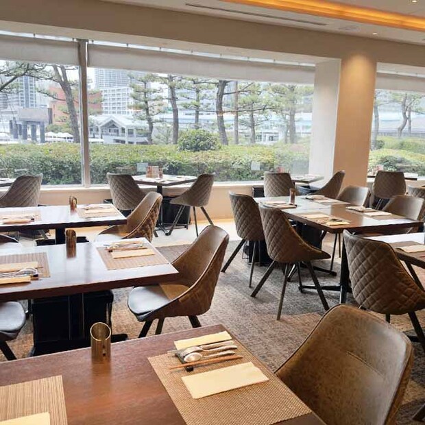 竹芝駅直結の、ホテル インターコンチネンタル 東京ベイ「シェフズ ライブ キッチン」。東京湾を望む景色とともに、リラックスした空間で味わえます。