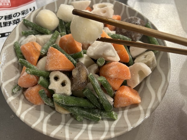 業務スーパーの「7種の彩り和風野菜ミックス」は、和食に不可欠なにんじん、さといも、れんこん、さやいんげん、しいたけ、大根、ごぼうの7種類が入った冷凍野菜です。