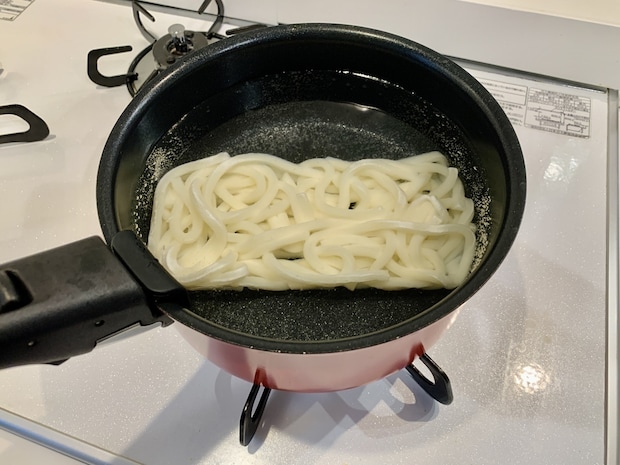 調理方法は、熱湯で1分30秒ゆでるか、電子レンジ(500W)で4分加熱するかの2通りです。麺は横長なので鍋調理の際は大きめの鍋が必要ですが、レンジ調理なら洗い物も減らせて時短になります。