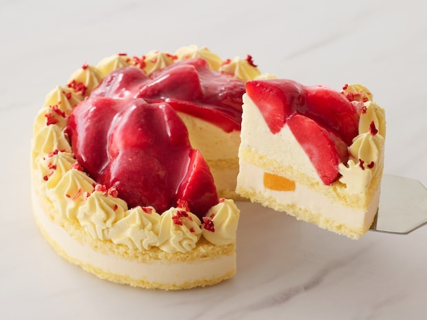 艶やかな紅ほっぺを宝石のように敷き詰めたケーキ「パニエフレーズ」は、チーズのほどよい酸味と香ばしいグラハムクッキーが飽きさせない、ルタオのニューヨークチーズケーキ。その上に、ミルキーなマスカルポーネムースと優しい甘さのカスタード生クリーム、甘酸っぱい国産イチゴ「紅ほっぺ」をたっぷり敷き詰めた。数量限定。
