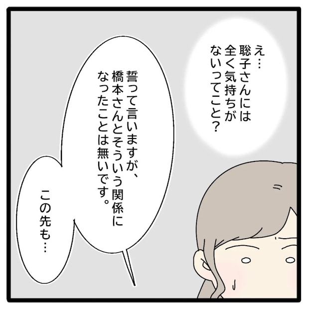聡子さんには、はじめから正志に対する気持ちなどなかったようです。彼女は動揺する私に追い打ちをかけるようにキッパリ言いました。「誓って言いますが、橋本さんとそういう関係になったことはないです、この先も・・・」
