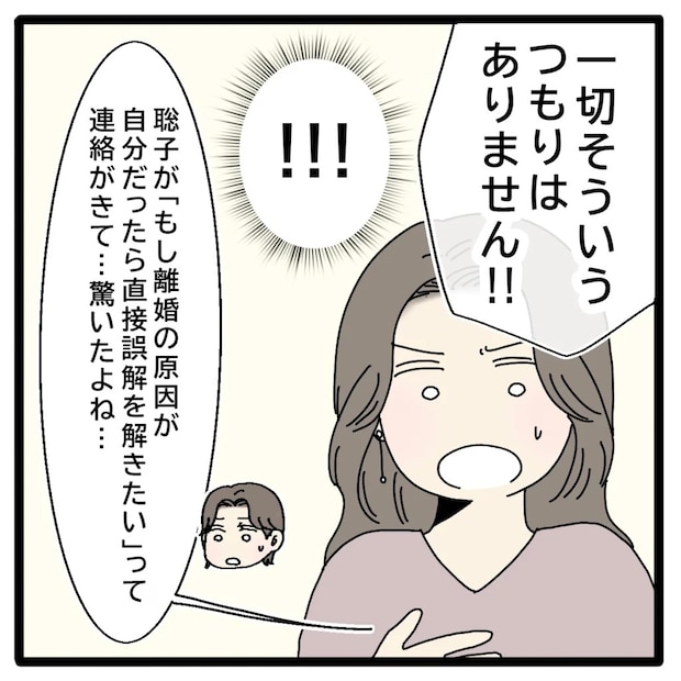 「一切そういうつもりはありません!」私の目をまっすぐ見てそう言い切った聡子さんが、とても嘘を言っているようには思えませんでした。これまでの出来事は、すべて正志が1人で進めてきたこと。その事実を知った私は、頭を殴られたような衝撃を受けました。すると美沙ちゃんが、「聡子が『もし離婚の原因が自分だったら直接誤解を解きたい』って連絡がきて、驚いたよね」と声をかけてくれます。