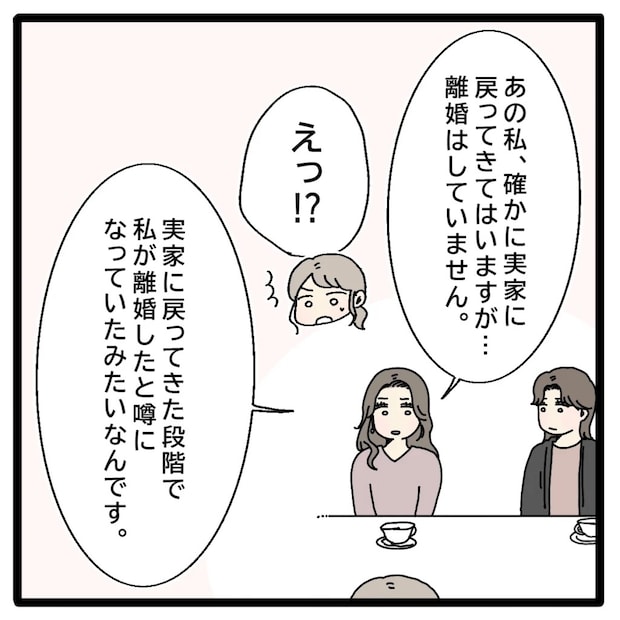 すると聡子さんは「あの私、確かに実家に戻ってきてはいますが、離婚はしていません」と衝撃の事実を口にしました。どうやら、実家に戻ってきた聡子さんを見て、周囲が「離婚して戻ってきた」と勘違いし、そのまま噂だけが一人歩きしてしまったようです。