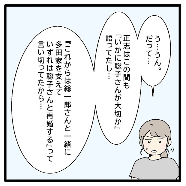 「だって、正志はこの間も『いかに聡子さんが大切か』語ってたし、『これからは総一郎さんと一緒に多田家を支えていずれは聡子さんと再婚する』って言い切ってたから・・・」私は驚きを隠せないまま、つい数日前に正志から聞かされた言葉を、そのまま聡子さんに伝えました。