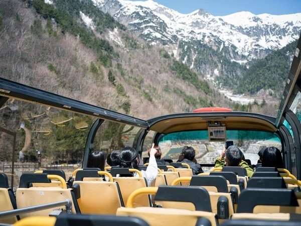 都心部の観光バスでは味わえない、奥飛騨だからこそ実現できる圧倒的な絶景に身を置く非日常の体験が楽しめる。