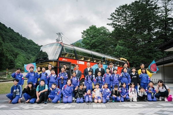 初年度となった2025年に、「おくひだマウンテンバス」の名づけ親となった地元小学校の児童とともに試走式を開催