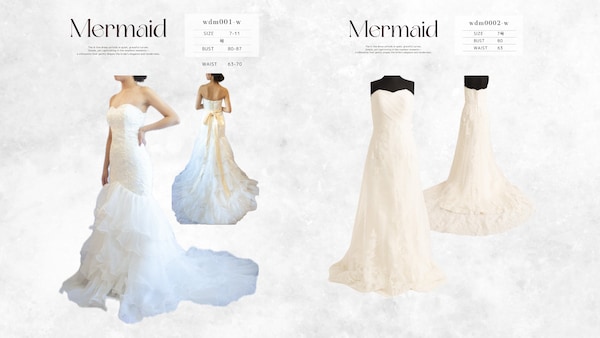 「マーメイドラインドレス」は、身体のラインを美しく引き立てる洗練されたデザイン。構築的なシルエットが写真全体を引き締め、都会的で上質な前撮り表現を叶える一着となっている。