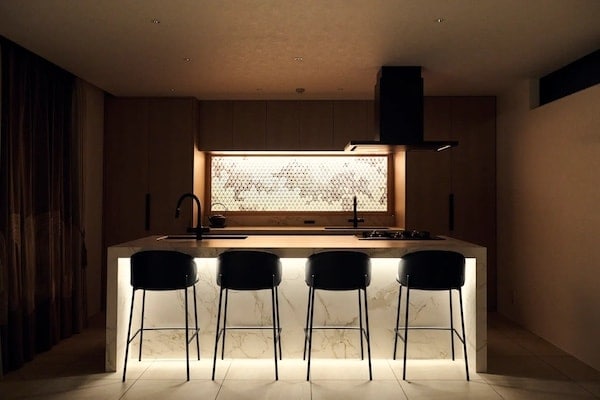 2階は「洞窟のリビング」。大型ソファに白亜のアイランドキッチンがあり、複数人での対話にも、ひとりでの内省にも対応する余白のある空間になっている。設備は、大型ソファ、アイランドキッチン、冷蔵庫2台、組子細工。