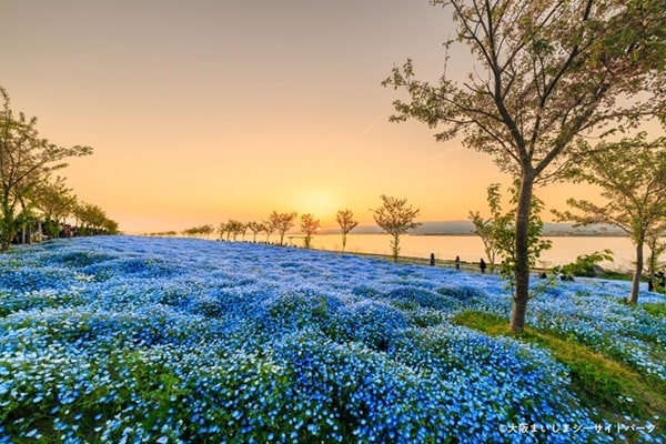 開催期間中は土日祝日とゴールデンウイーク限定で18:30までのロング営業も実施。日本列島夕陽と朝日の郷づくり協会が選定した「日本の夕陽百選」に選ばれた舞洲の夕陽に照らされ幻想的に輝くネモフィラは必見だ。