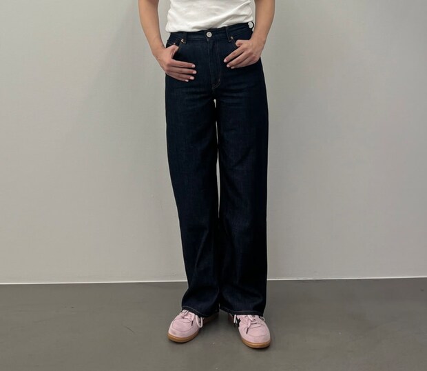 こちらもフレアデニムですが、より「脚を長く美しく見せる」ことにフォーカスしているのが特徴。何よりびっくりしたのははき心地のよさ。その秘密は【マウジー】が開発した革新的なストレッチ素材「ハイパワーストレッチ」にあるようで。って、デニムブランドじゃないのにデニム生地を独自で開発していることにも驚きましたが、抜群の伸縮性と軽さは一度脚を通すとヤミツキになること必至。じつはこのデニムだけ26インチをはいているのですが(他は27インチです! )、窮屈さも感じなかったですよね。けっこうタイトなシルエットなのに。これは間違いなくハイパワーストレッチのおかげで、まさにストレスフリーのはき心地を味わうことができます。