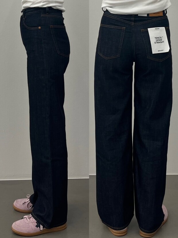 こちらも「TENCEL ™ DENIM STRAIGHT」なんですが、ワンウォッシュだと印象もだいぶ変わりますよね。なんだかすごく大人っぽい。そして色が濃いからか、同じサイズなのにすごく引き締まって見える気がします。まっすぐとしたストレートシルエットもさらに引き立つ感じもありますし、気になる腰まわりも視覚的にひとまわり小さくなったような。どちらを選ぶかは完全に好みの問題ですが、こなれた雰囲気ではくならライトブルー、品よくスタイルアップを狙うならワンウォッシュがベターな選択かと思われます。