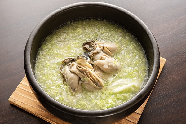 冬に提供する「牡蠣と白菜の鬼おろし鍋」は、カツオと昆布の出汁に、牡蠣の深いコクと野菜の甘みが溶け出した熱々のうま味鍋。白菜と三島大根の、とろとろザクザク食感がアクセントとなる。