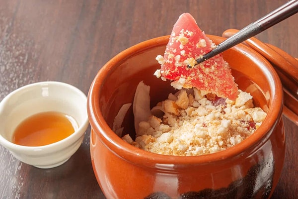 壺の中にマグロ、あられ、薄切り大根、地海苔が入った、新しいマグロの楽しみ方を提供する料理だ。