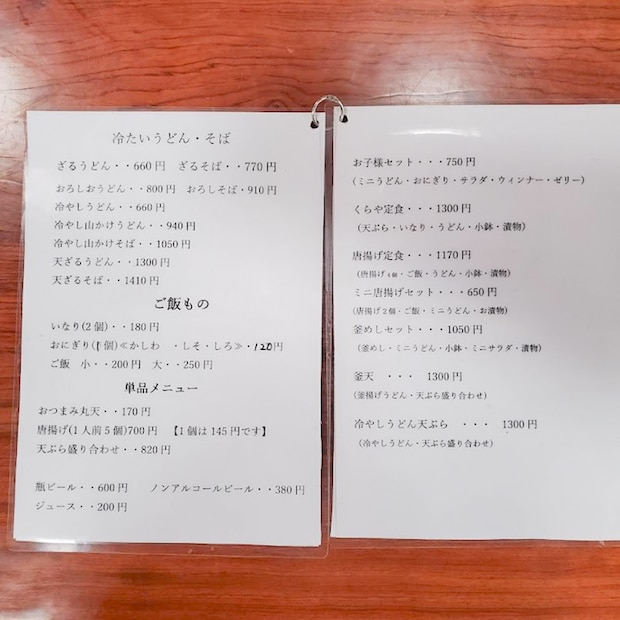 卓上のメニューを開くと、かけうどん(440円)やごぼう天うどん(600円)などの定番から各種定食、丼ものまで魅力的なラインナップが並んでいます。