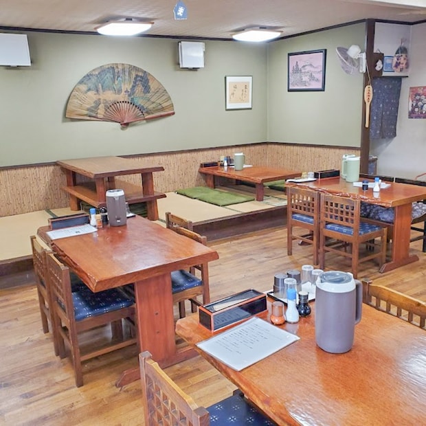 使い込まれた木製テーブルには年月を重ねた味わいがあり、小上がりの畳席とともにどこか懐かしい雰囲気です。