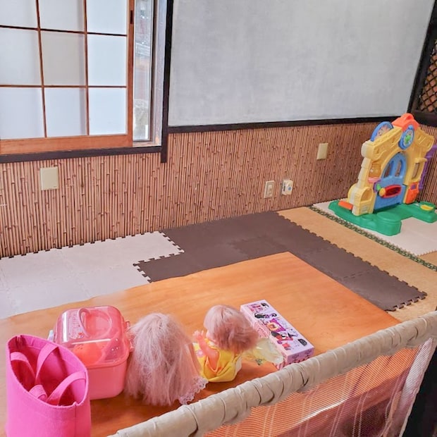 ジョイントマットが敷かれたスペースには、おもちゃやぬいぐるみが用意されており、料理を待つ間も退屈せずに過ごせる工夫が施されていました。