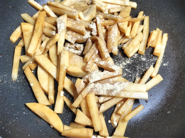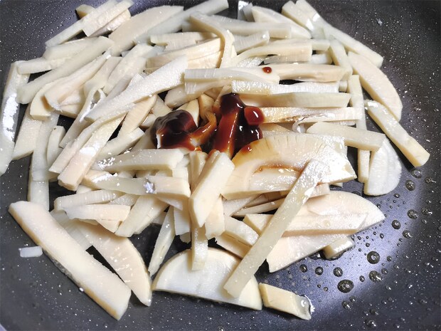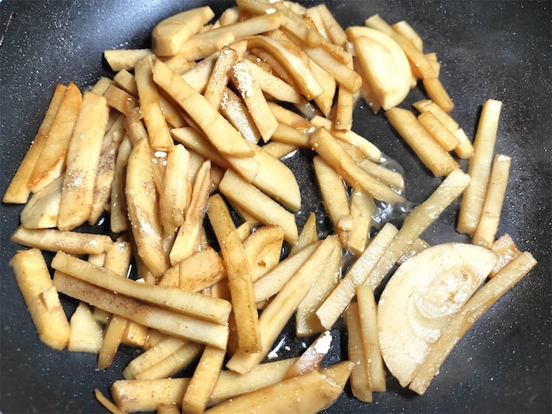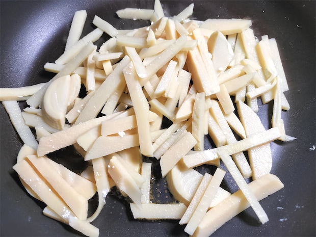 3. フライパンを洗わずにゴマ油をひき、たけのこを加えて炒めます。