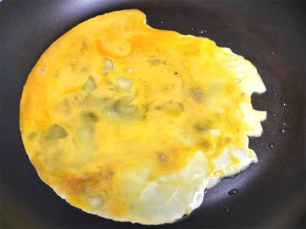 2. フライパンにサラダ油をひいて中火にかけ、温まったら1を加えます。かき混ぜながら卵を中央に集め、半熟状態になったら取り出しておきます。