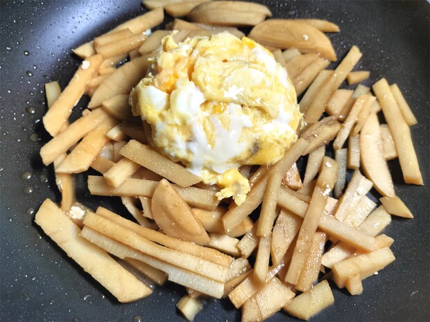 食材は青ねぎを除けば、たけのこと卵だけというシンプルな料理ですが、味を入れながら炒めていくと、次第にたけのこの色が濃くなり、香りが立ってくるのが分かります。