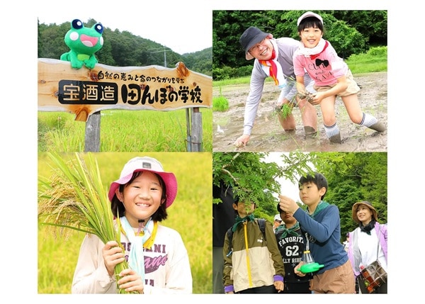 「宝酒造『田んぼの学校』」は、お米づくりや里山の散策などを通して、生物多様性の大切さを体験しながら、自然の恵みと命のつながりを親子で学ぶ体験授業。