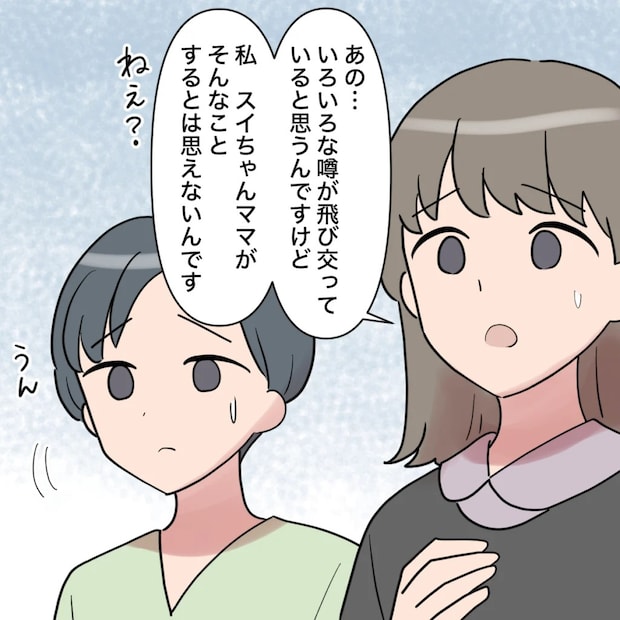 すると、ひとりのママさんが「あの・・・いろいろな噂が飛び交っていると思うんですけど、私はスイちゃんママがそんなことするとは思えないんです」と口を開きました。その言葉に、隣にいた別のママさんも同意するように頷きます。
