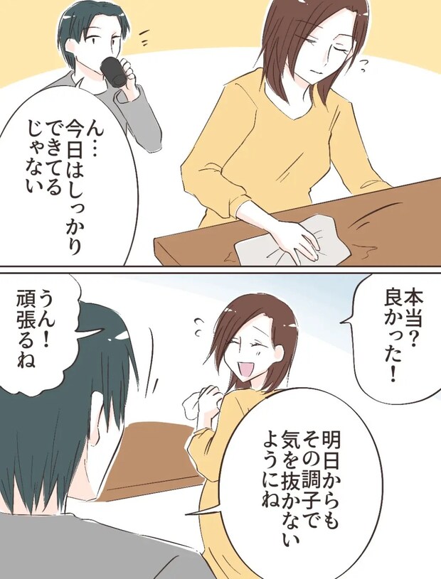 いつも色々なアドバイスをくれるリヒトさんのサポートをするために仕事もやめたハズキさん。リヒトさんは結婚後も今の生活を変えるつもりはないと生活スタイルに合わせるよう言った上で、完璧にできないハズキさんを責めるように。その後、妊娠したハズキさんのつわりが重く、家事もままならなくなるとストレスを感じたリヒトさんは、ハズキさんの代わりに家事をしてくれるユウコさんという女性を雇い男女の関係に。二人の関係に何となく勘づいていたハズキさんは、自分が悪いと思い込み何も言えません。そんなハズキさんを憐れむユウコさんは、「女をただの道具としか思ってない」とリヒトさんを批判し、「お金が貯まったしあんな男といる意味ない」とあっさり家を出て行ってしまいました。ユウコさんの不在を知ったリヒトさんが慌てて探すも見つからず、連絡も取れずにイライラ。ハズキさんを換気扇の掃除ができていないと責め、詰め寄るリヒトさんのハズキさんへの当たりが一層きつくなり、「その涙になんの意味があるんだ!」そう言ってハズキさんを責めました。そして、ユウコさんの代わりの人を探すと言われたハズキさんは、「私・・頑張るから・・」と全てをこなす決意をしたのでした。