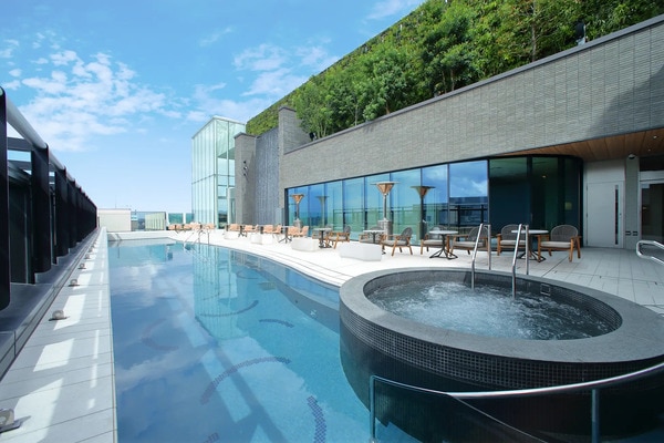 博多駅直結・徒歩1分という都心にありながら、屋上にはオープンエアの「泳げる天然温泉」であるプール付きスパを設置。さらに客室は全室30㎡超で、全ての客室に洗い場付きのゆったりとしたバスルームを備えている。