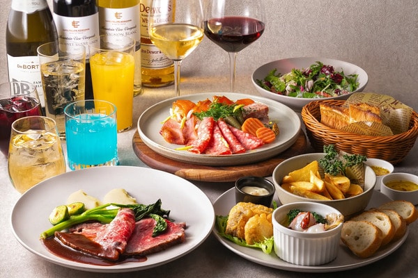 料理はシェアしながら楽しめる大皿スタイルで用意。オードブル盛り合わせや日替わりのサラダ、メインにはしっとりと焼き上げたローストビーフなど、食べ応えと華やかさを兼ね備えたメニューが取り揃えられている。