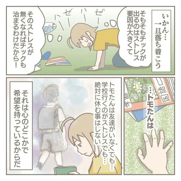 トモたんのチック症が気になって仕方がないヨカさん。そして改めて、トモたんが抱えるストレスを感じるのでした。