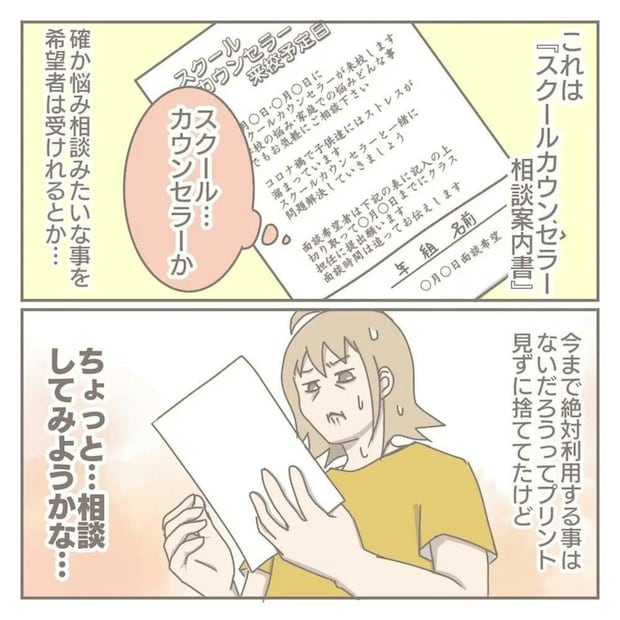 そこで見つけたスクールカウンセラーの手紙。試しに相談をしてみるのもいいかもしれない…。と思うのでした。何かよいアドバイスがもらえるかもしれません。