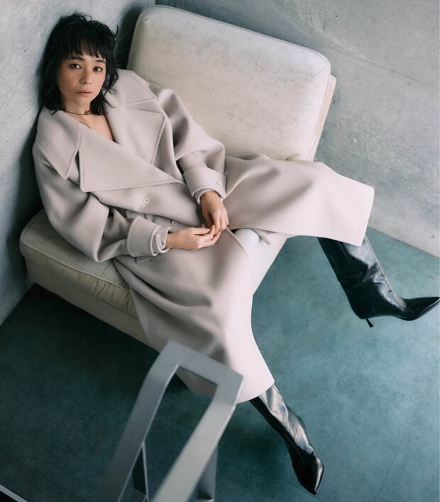 大きめのダブルカラーが華やかなロングコートは尾州製の上質なウールを使用した、ブランドを代表する1着。ドラマティックに広がるフレアシルエットは、デイリーにはもちろん、フォーマルシーンにも。品のある絶妙カラーもポイント。コート¥66,000、チョーカー¥5,500(共にヴェニカ/Souple)、ブーツはスタイリスト私物