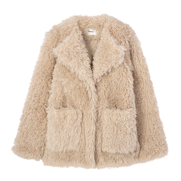 今季らしいフェイクファーコートは、長い毛足とボリュームに反して、軽やかな着心地が特徴。優しいエクリュカラーは着まわし力も抜群。ファーコート¥55,000(ヴェニカ/Souple)