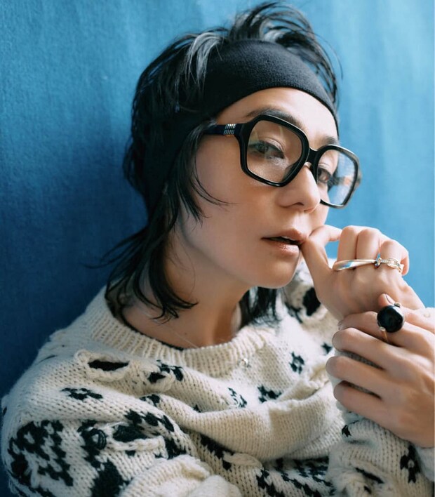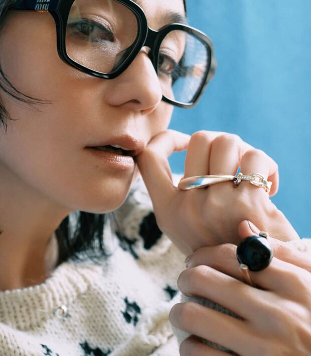 小物使いでコーデを底上げ! 眼鏡¥55,990(ミュウミュウ/ルックスオティカジャパン カスタマーサービス)、ネックレス[SV×オニキス]¥45,000、ボールネックレス[SV]¥40,000、右手ダブルフィンガーリング[SV]¥60,000、右手小指リング[SV×DIA]¥70,000、左手リング[SV×オニキス]¥40,000(全てロロ)、ニット¥176,000(ピリングス/リトルリーグ インク)、ヘアバンド¥7,590(ヘイップ/ル タロン グリーズ ルミネ新宿店)