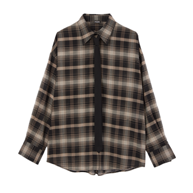 さり気なく透け感のある素材を使用。ボウタイ付きチェックシャツ¥27,000(PHERE)