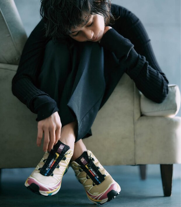 キレイめにもモードにもマッチするモダンなデザインが人気。オールブラックのコーデにカラフルな足元がいいアクセントに。スニーカー〈XT-6〉¥28,600(サロモン/アメアスポーツジャパン)、ニット¥27,500、パンツ¥35,200(共にインパーフ)