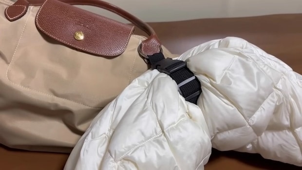 そんなときに便利なのが、脱いだ上着やマフラーをバッグに固定して持ち運べる、カラビナつきのジャケットホルダーです。使い方はバックルを外して上着などを挟むだけと、とっても簡単!